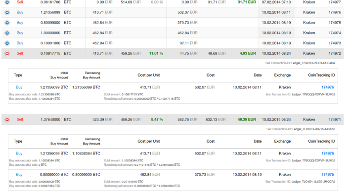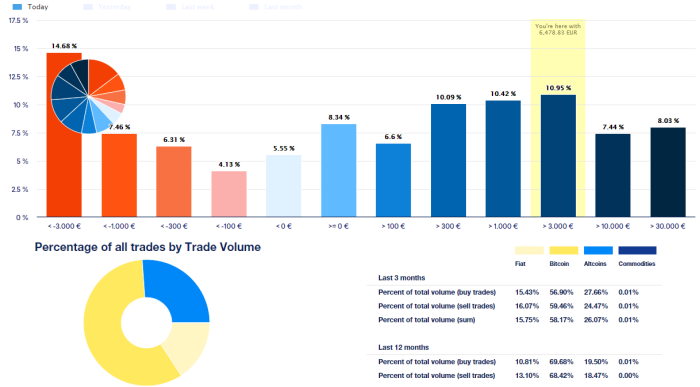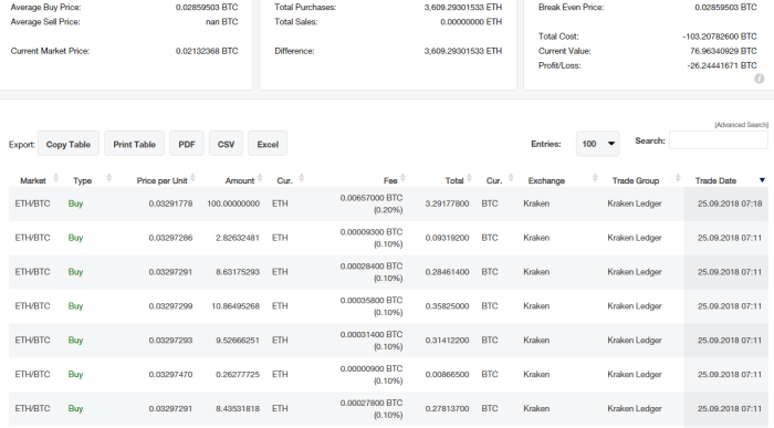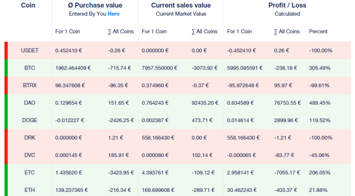 Detailed coin pair analysis. Calculates your average purchase and sales price, your break even price and profit or loss.