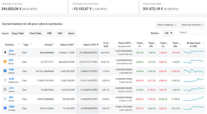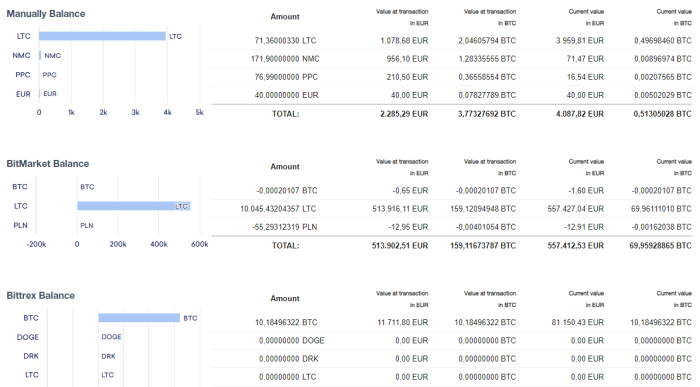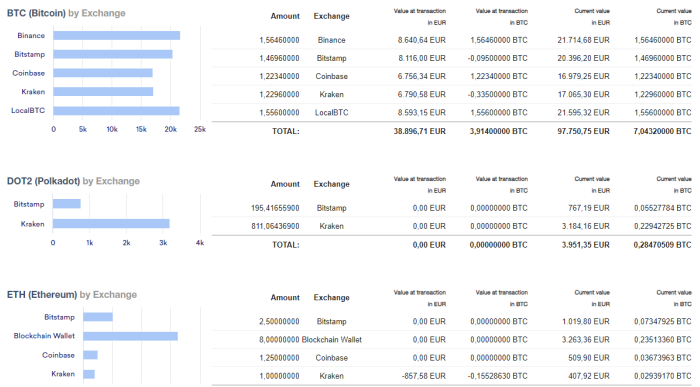 The location of all your coins, assets and currencies with their amount and value by exchange, transaction type or trade-group.