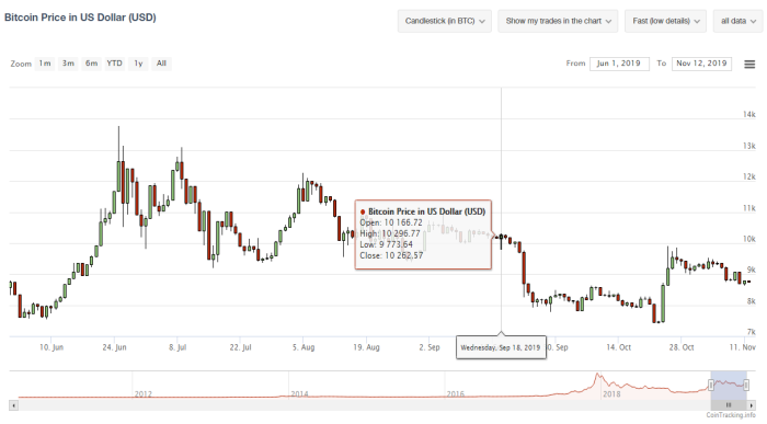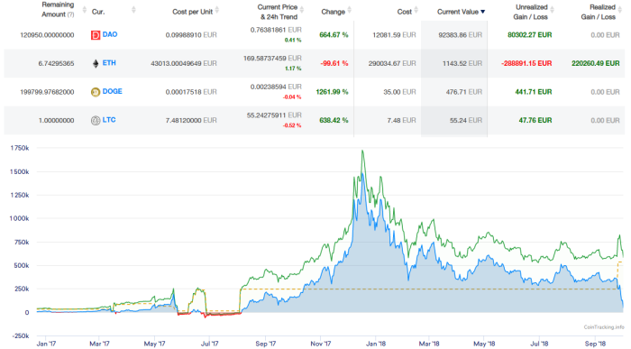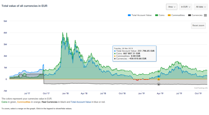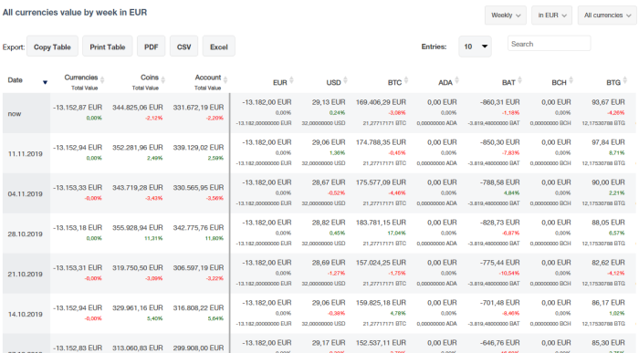 The value and the amount of all your currencies grouped by day, week or month. Ideal to determine the value of your portfolio at any time in the past.