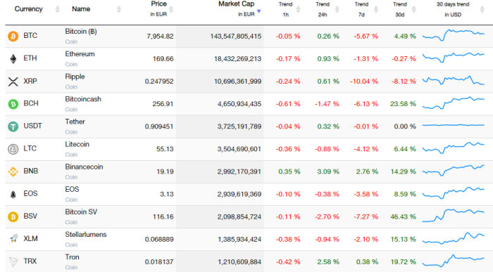A pricelist of all digital currencies available on the market with price trends, market cap and the current order volume.