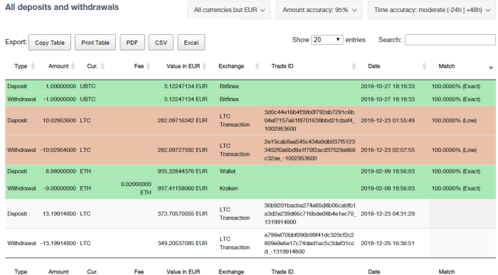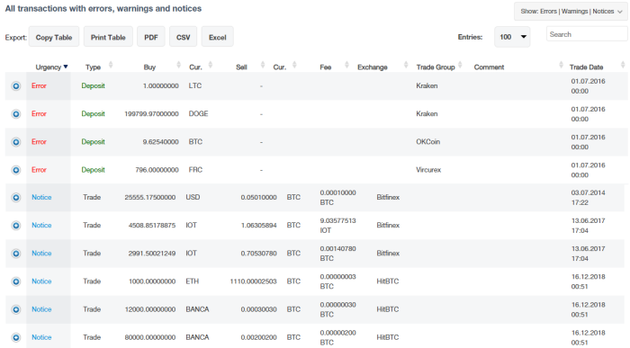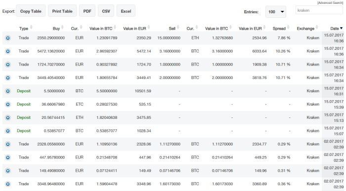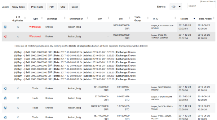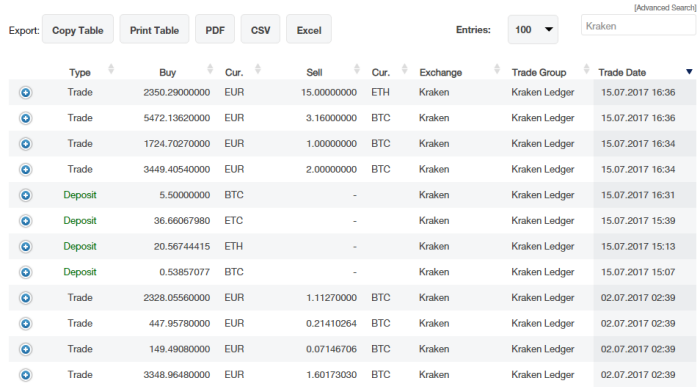 Table with all your transactions that can be filtered and searched by type, exchange, date, etc.