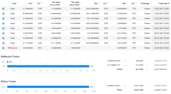 Table and graphical view of all your fees, including the calculated fee value at transaction or on a particular date. Contains a chart that groups all fees by exchange or group.